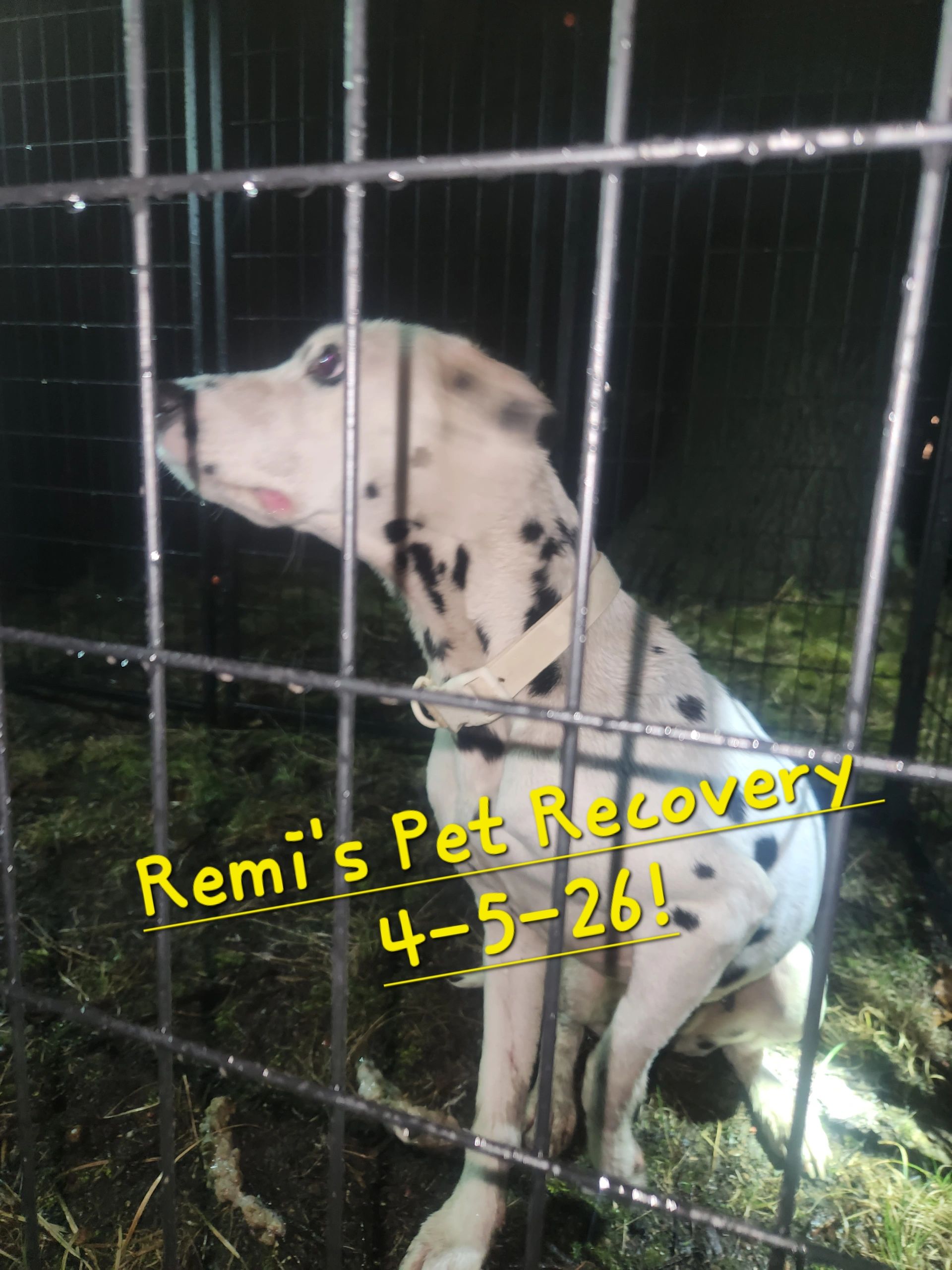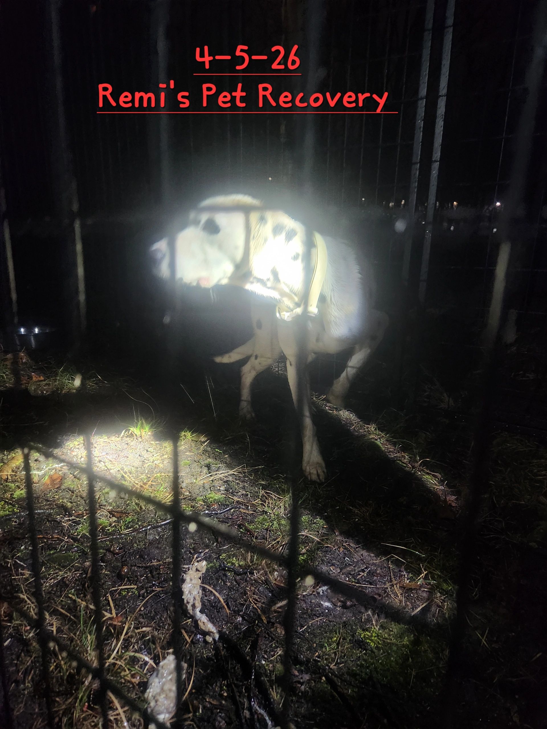 Gotcha! Patience, team work and persistence pays off for Remi's and Strongsville ACO, Chuck McCleary! Yoshi had been quite the clever girl eluding all who tried to capture her- her luck would run out after being successfully captured in Remi's state-of-the-art Laser Kennel at 11:10pm 4/5/26